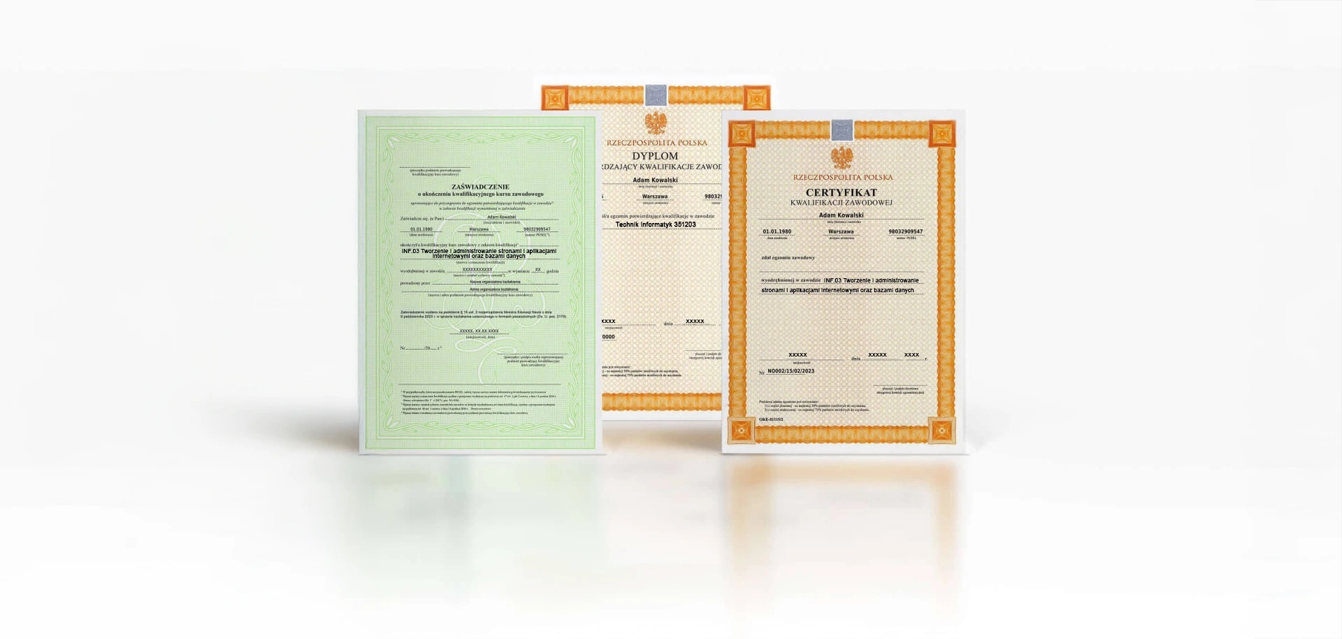 Po zdanym egzaminie zawodowym dodatkowo uzyskuje się Certyfikat potwierdzający kwalifikacje w zawodzie.